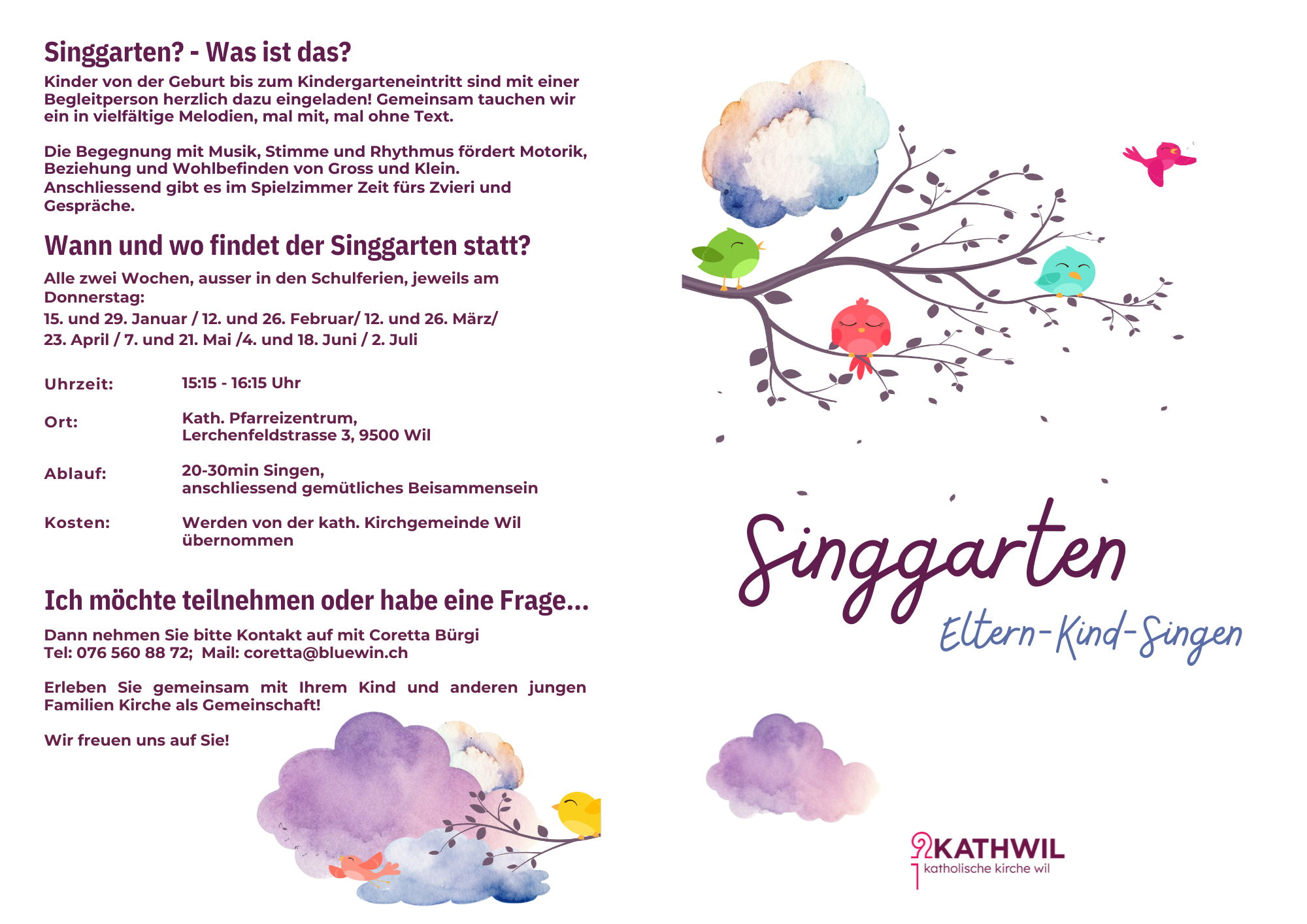 Der Singgarten lädt Kinder von der Geburt bis zum Kindergarteneintritt gemeinsam mit einer Begleitperson zu einer musikalischen Entdeckungsreise ein. Gemeinsam singen wir einfache Lieder und Melodien – mal mit, mal ohne Worte – und erleben Musik mit Stimme, Rhythmus und Bewegung.